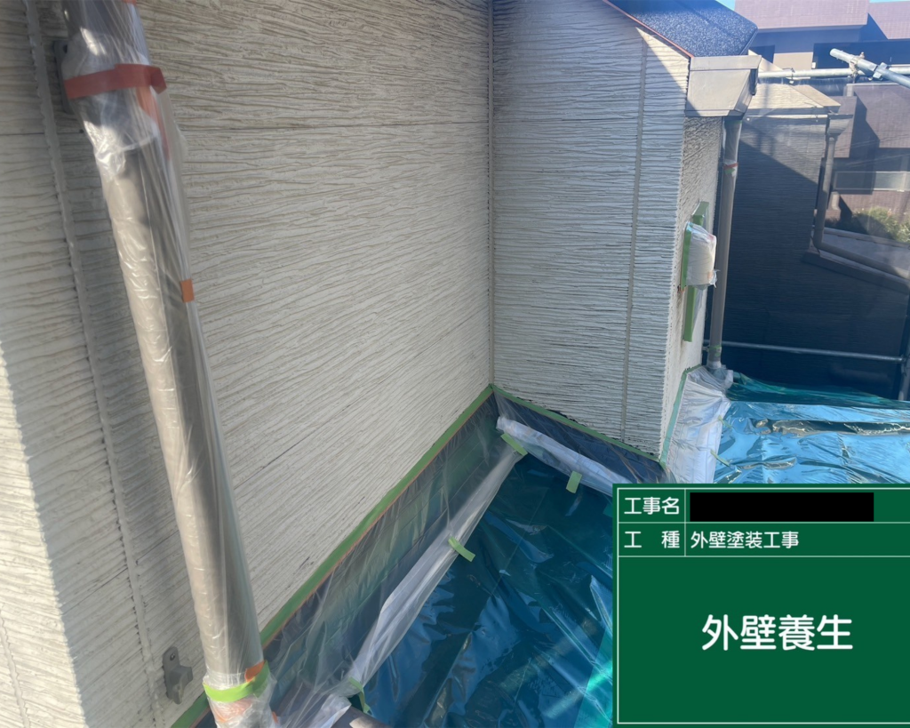 塗装工事を始める前に、窓や玄関、植栽などをしっかり養生(保護)し、周囲を汚さないように準備します。養生を丁寧に行うことで、仕上がりが美しくなり、塗料の飛散を防ぐことができます!