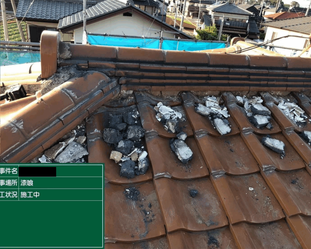 崩れかけていた箇所は慎重に手作業で落とし、周囲の瓦を傷つけないよう配慮しました。